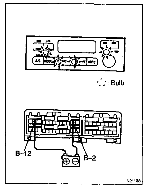 Connect the positive (+) lead from the battery to terminal B-12 and the negative (-) lead to terminal B-2, then check that the illumination lights up.