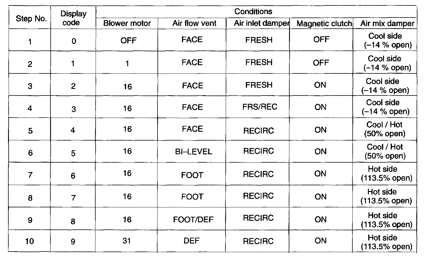 By operating each of the A/C control switches as shown in the diagram, it is possible to enter the diagnosis check mode.