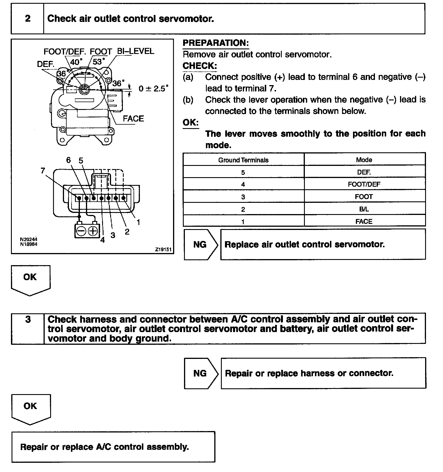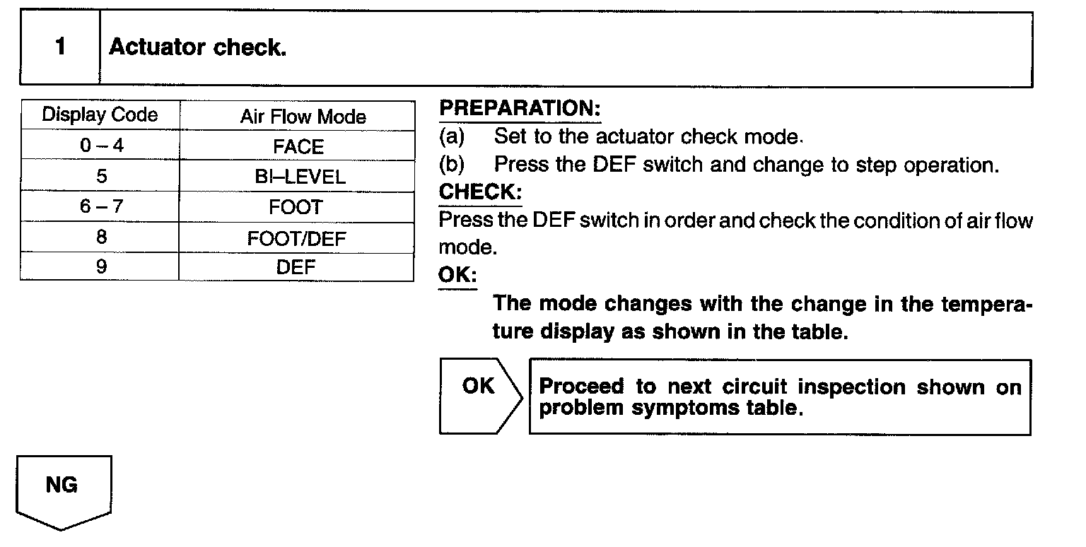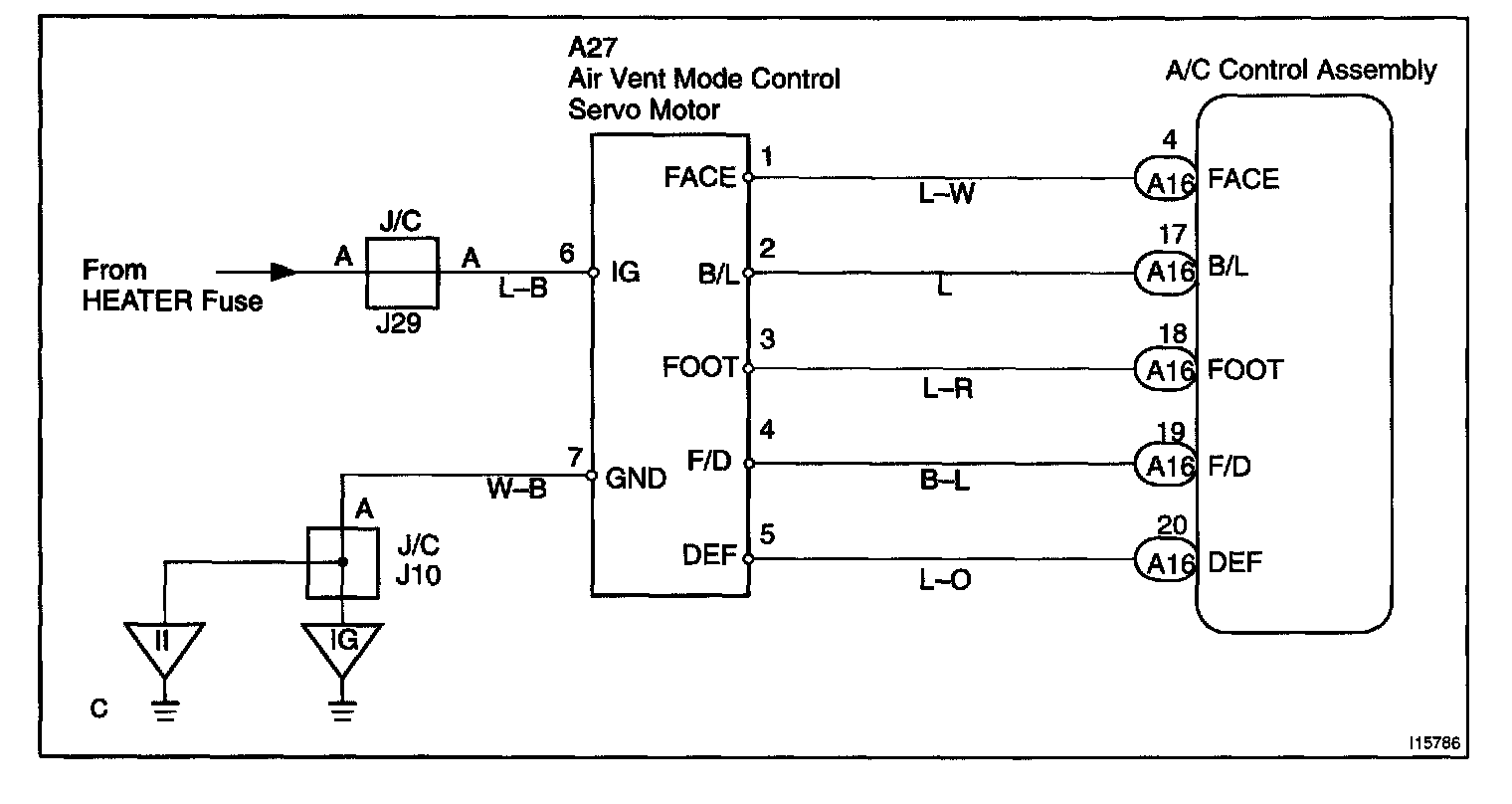 CIRCUIT DESCRIPTIONThis circuit turns the servomotor and changes each mode damper position by signals from the A/C control assembly. When the AUTO switch is ON, the A/C control assembly changes the mode automatically between FACE, BI-LEVEL and FOOT according to the temperature setting.