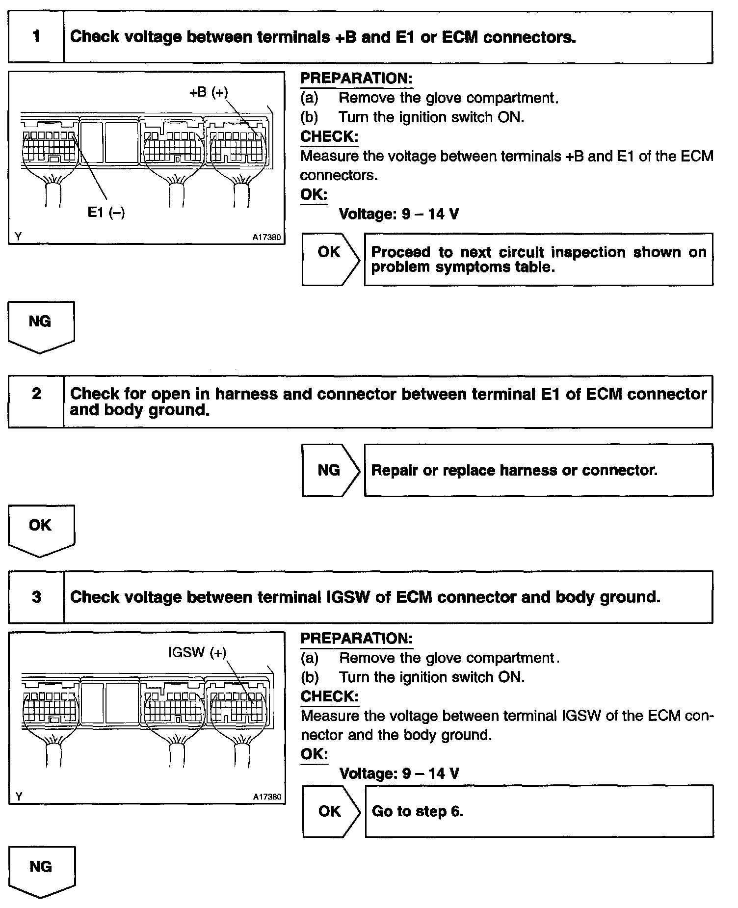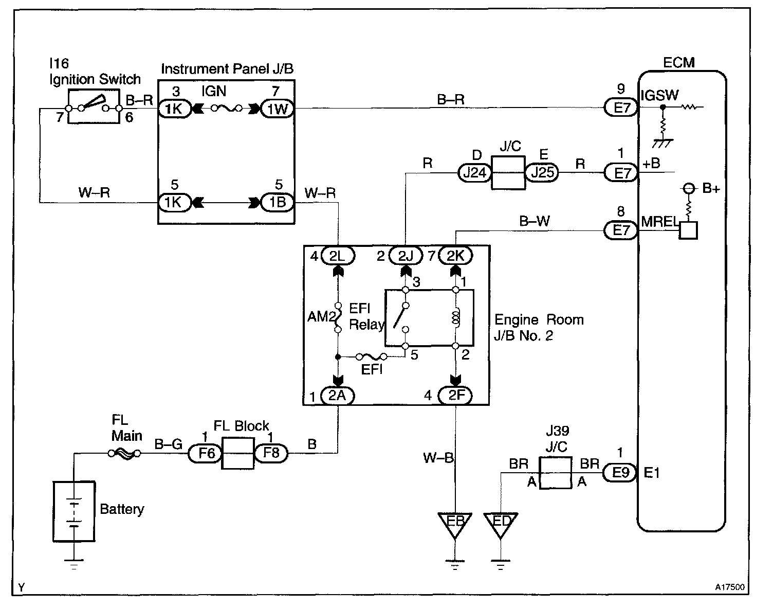 This signal causes current to flow to the coil, closing the contacts of the EFI main relay and supplying power to terminals +B of the ECM.