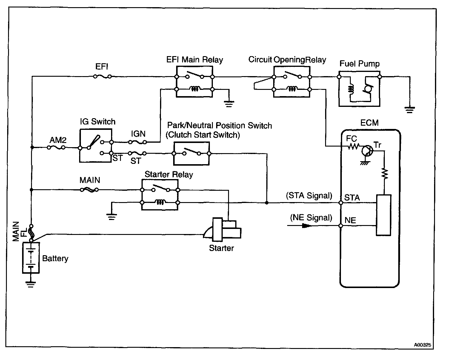 CIRCUIT DESCRIPTIONIn the diagram, when the engine is cranked, current flows from terminal ST of the ignition switch to the starter relay coil and also current flows to terminal STA of the ECM (STA signal).