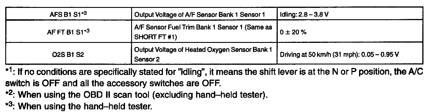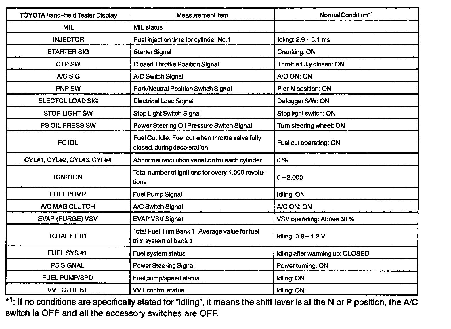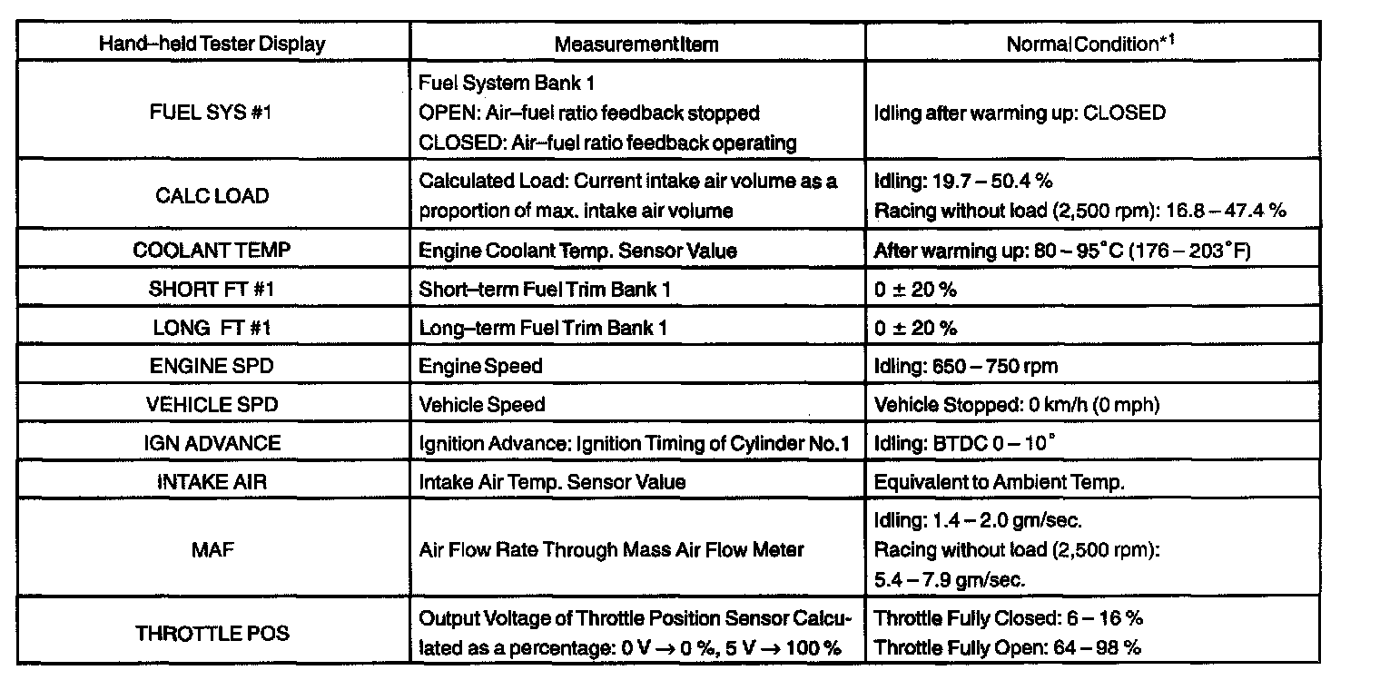 ENGINE OPERATING CONDITIONNOTE: The values given below for "Normal Condition" are representative values. So, a vehicle may still be normal even if its value differs from those listed here. So, do not solely depend on the "Normal Condition" here when deciding whether a part is faulty or not.