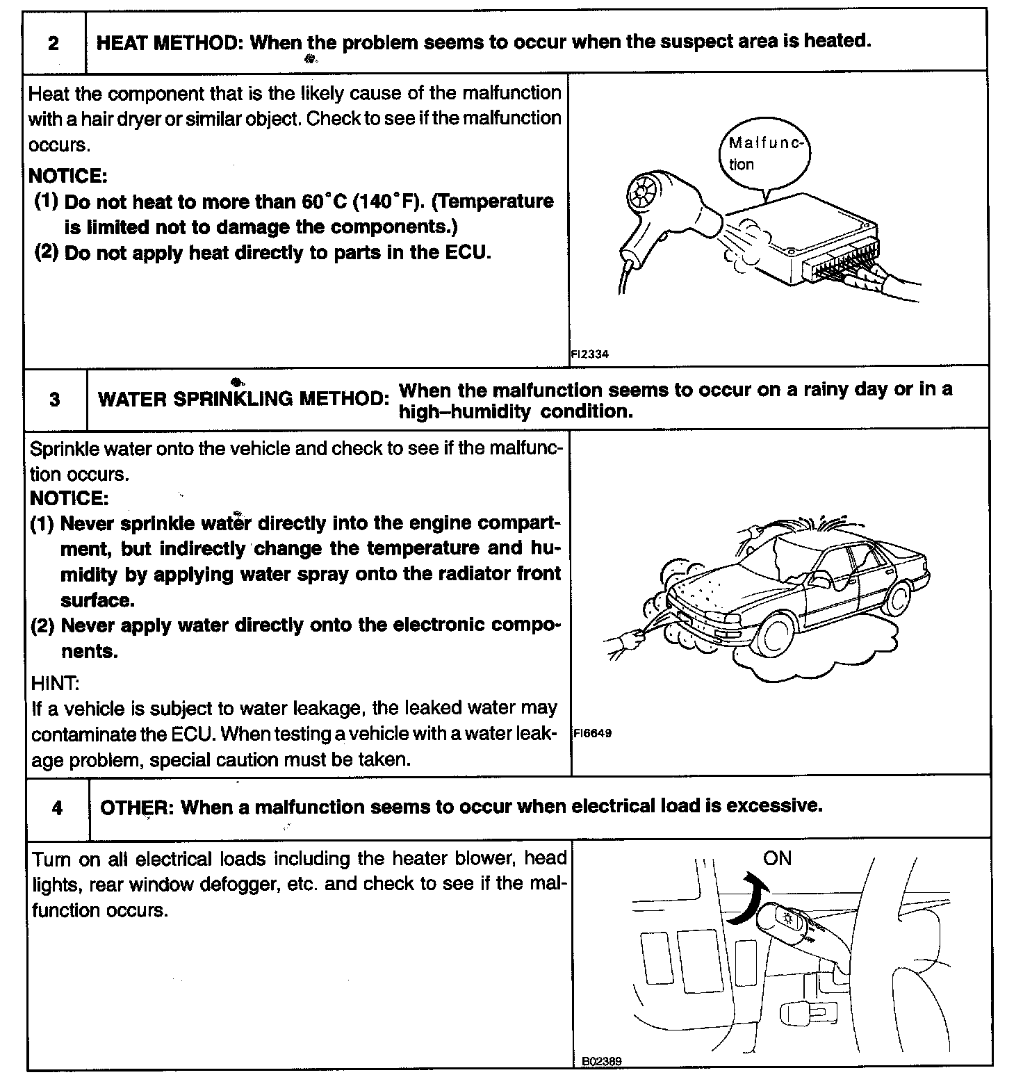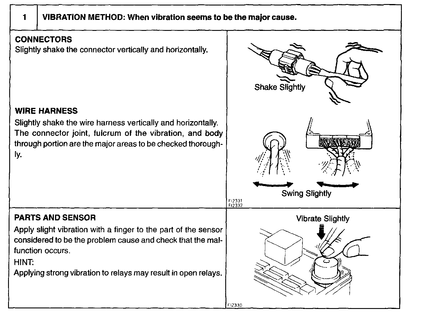 The most difficult case in troubleshooting is when there are no problem symptoms occurring. In such cases, a thorough customer problem analysis must be carried out, then simulate the same or similar conditions and environment in which the problem occurred in the customer's vehicle. No matter how much experience a technician has, or how skilled he may be, if he proceeds to troubleshoot without confirming the problem symptoms he will tend to overlook something important in the repair operation and make a wrong guess somewhere, which will only lead to a standstill. For example, for a problem which only occurs when the engine is cold, or for a problem which occurs due to vibration caused by the road during driving, etc., the problem can never be determined so long as the symptoms are confirmed with the engine hot condition or the vehicle at a standstill. Since vibration, heat or water penetration (moisture) is likely cause for problem which is difficult to reproduce, the symptom simulation tests introduced here are effective measures in that the external causes are applied to the vehicle in a stopped condition.