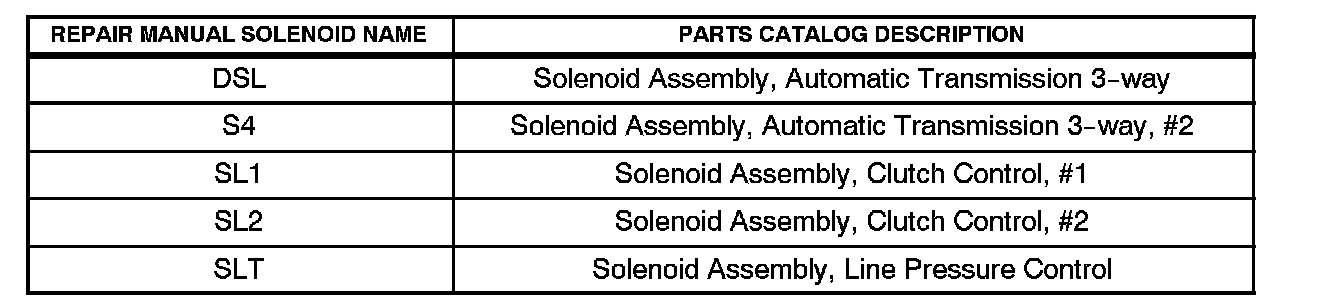 Provided below is a chart listing the repair manual name as well as the parts catalog name and description of the solenoids used in the U240E/U241E automatic transaxles.