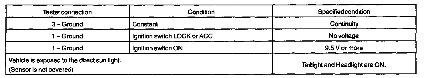 c. Verify that the lights will go off when the light control switch position is OFF or the area surrounding the sensor is bright or the driver's door is opened while the ignition switch is OFF.