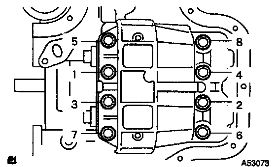 Temporarily tighten 8 bolts in several passes as the sequence shows, then fully tighten with specified torque.