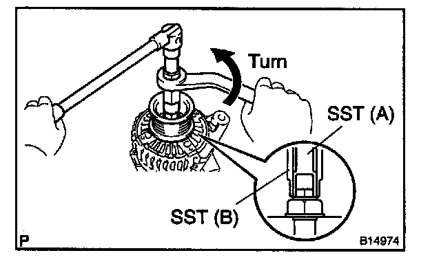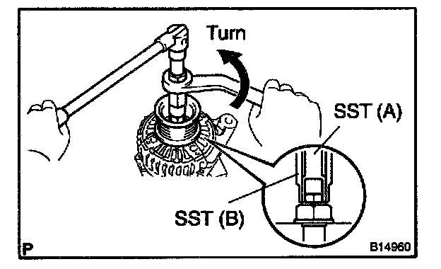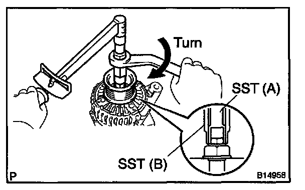 a. Hold SST (A) with a torque wrench, and tighten SST (B) clockwise to the specified torque.
