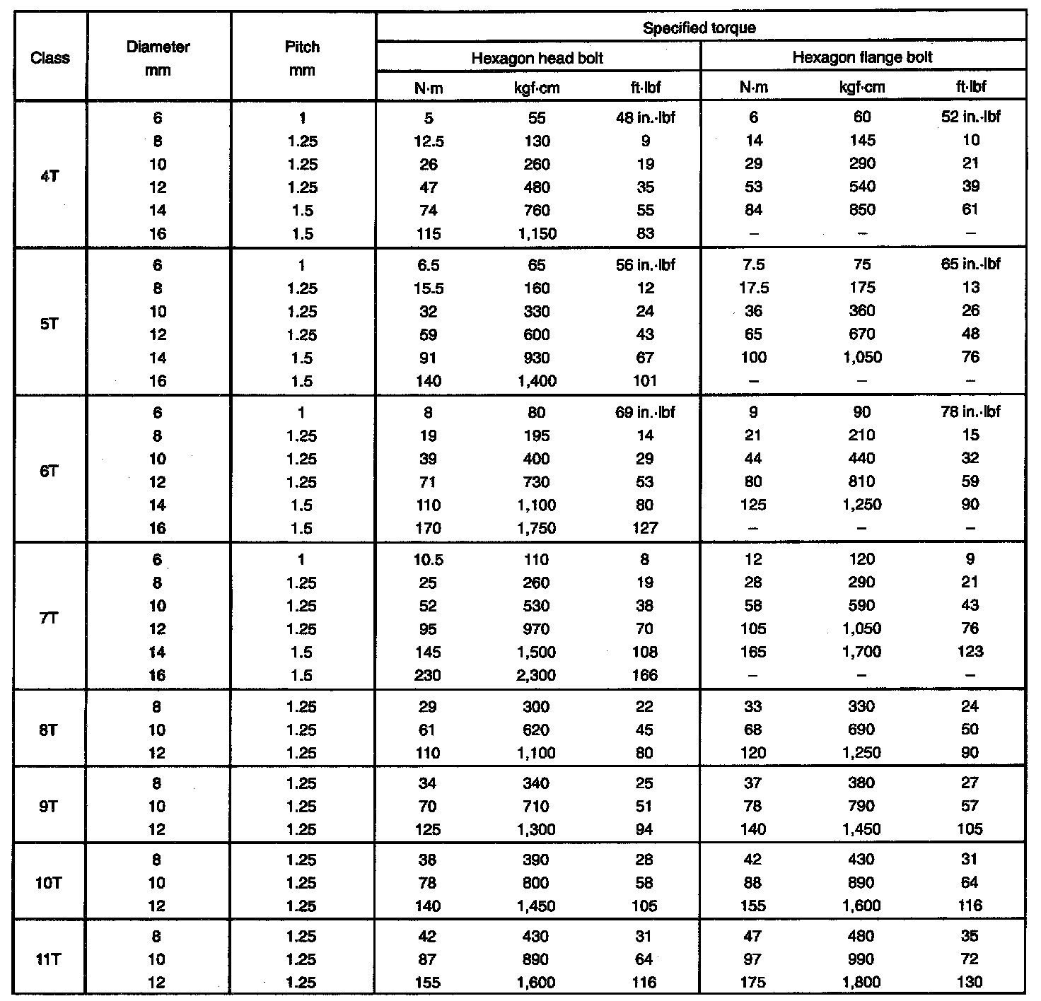 SPECIFIED TORQUE FOR STANDARD BOLTS