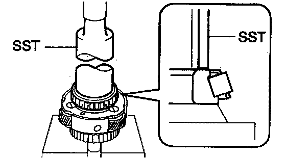 c. Using SST and a press, press in the outer race of the tapered roller bearing.