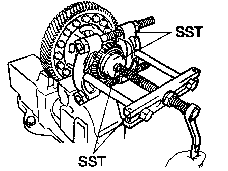 HINT: Set the claw of SST to the bearing inner race at the position where the differential case is indented.