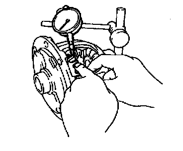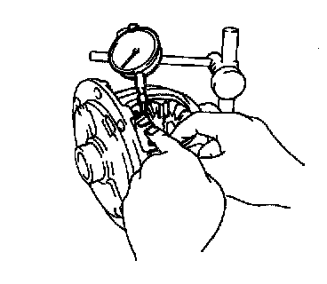 Using a dial indicator, measure the backlash of one side gear while holding one pinion toward the differential case.