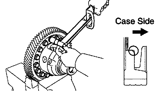 f. Using a chisel and hammer, caulk the pin holes around the circumference of the differential case.