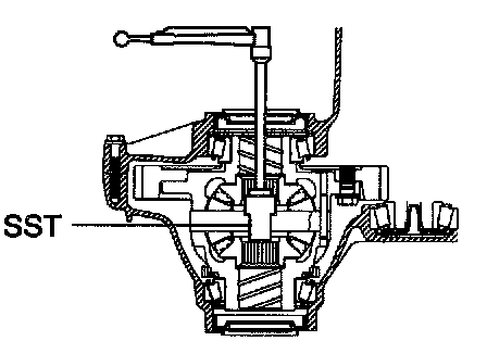 c. Using SST and a torque wrench, turn the differential case assembly right and left 2 or 3 times to allow the bearings to settle.
