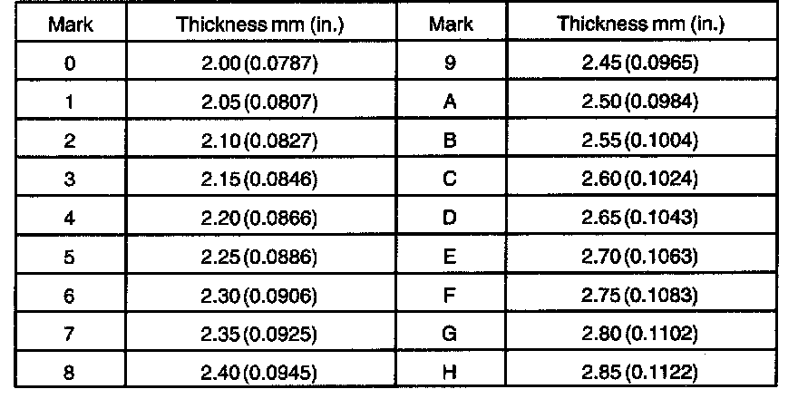 a. Install the correct thrust washers and side gears. Refer to the table, select thrust washers which will ensure that the backlash is within the specification. Try to select washers of the same size for both sides.