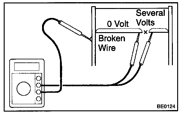 If there is approximately 10 V, the wire is broken between the center of the wire and the positive (+) end. If there is no voltage, the wire is broken between the center of the wire and ground.