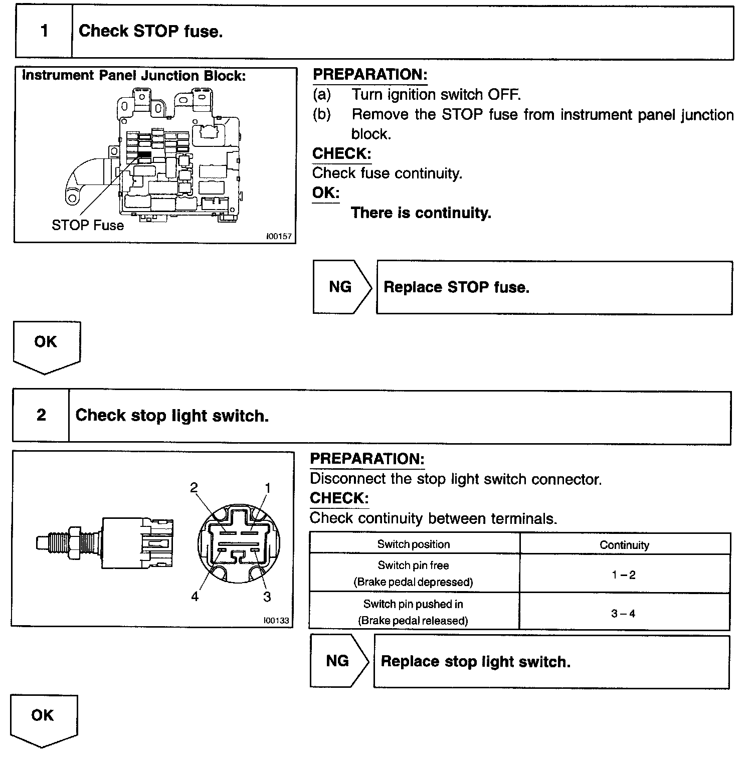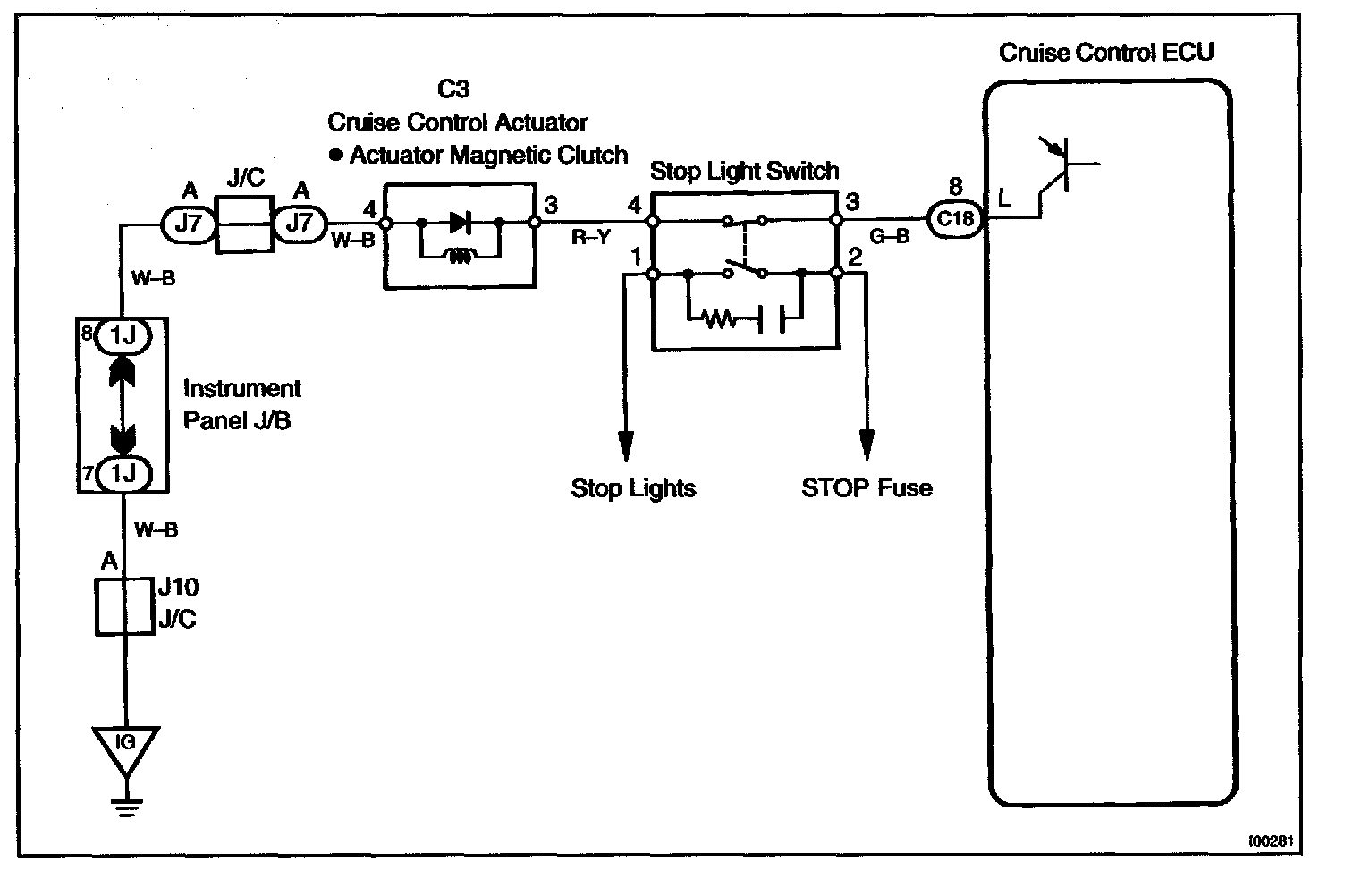When the brake pedal is depressed, the stop light switch turns on, supplying electrical power to the stop light. Power supply to the magnetic clutch is mechanically cut and the magnetic clutch is turned OFF. When driving downhill, if the vehicle speed exceeds the set speed by 15 km/h (9 mph), the ECU turns the safety magnet clutch OFF. If the vehicle speed later drops to within 10 km/h (6 mph), cruise control at the set speed is resumed.