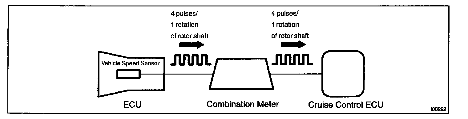 For each rotation of the shaft, the vehicle speed sensor sends a 4-pulse signal through the combination meter to the cruise control ECU (See the installation).