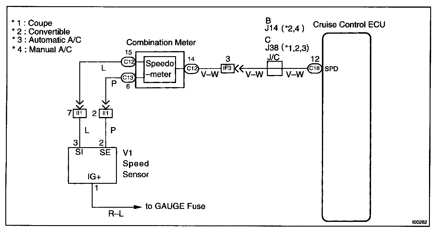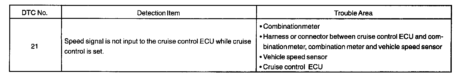 The signal from the vehicle speed sensor circuit is sent to cruise control ECU as vehicle speed signal.