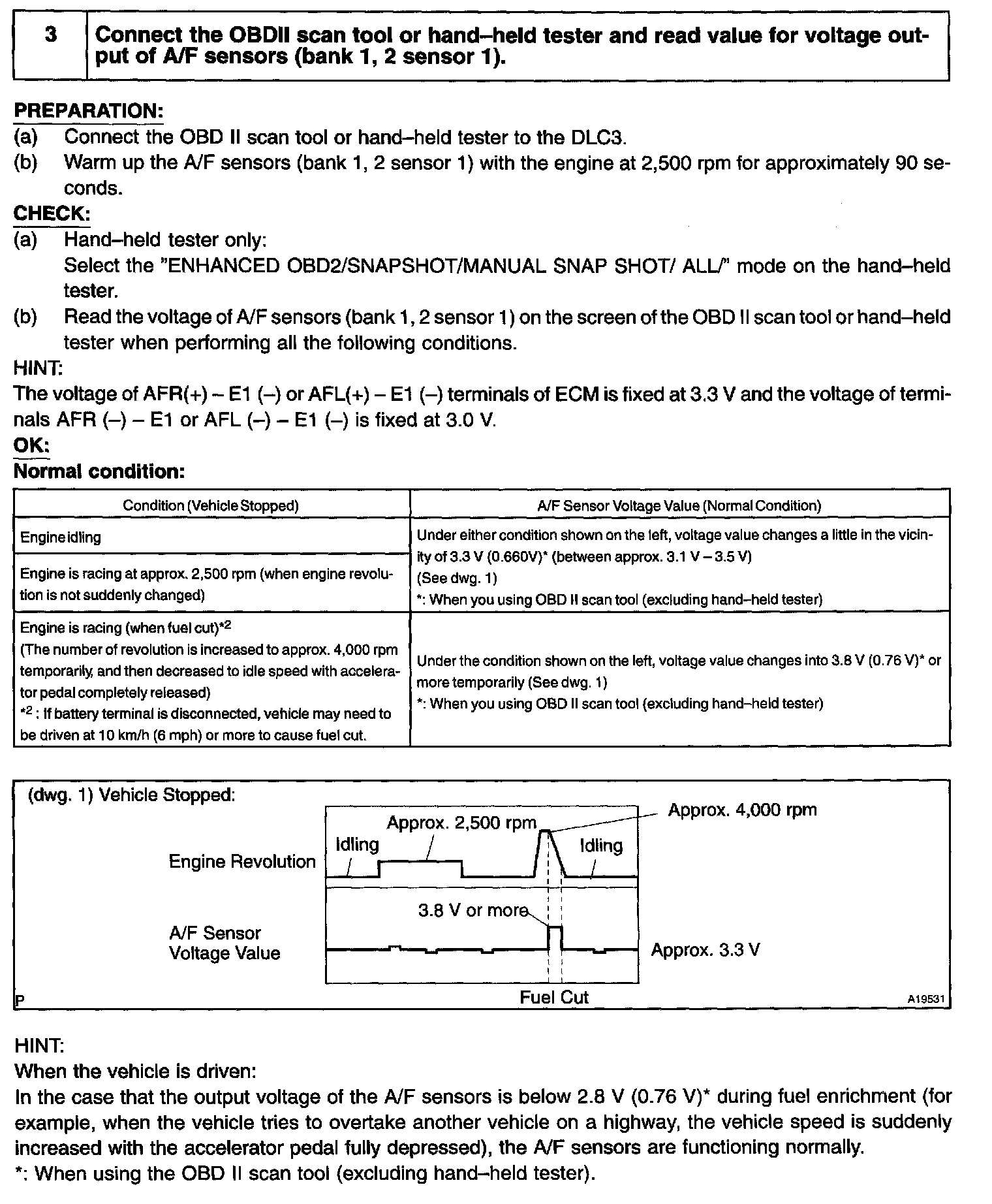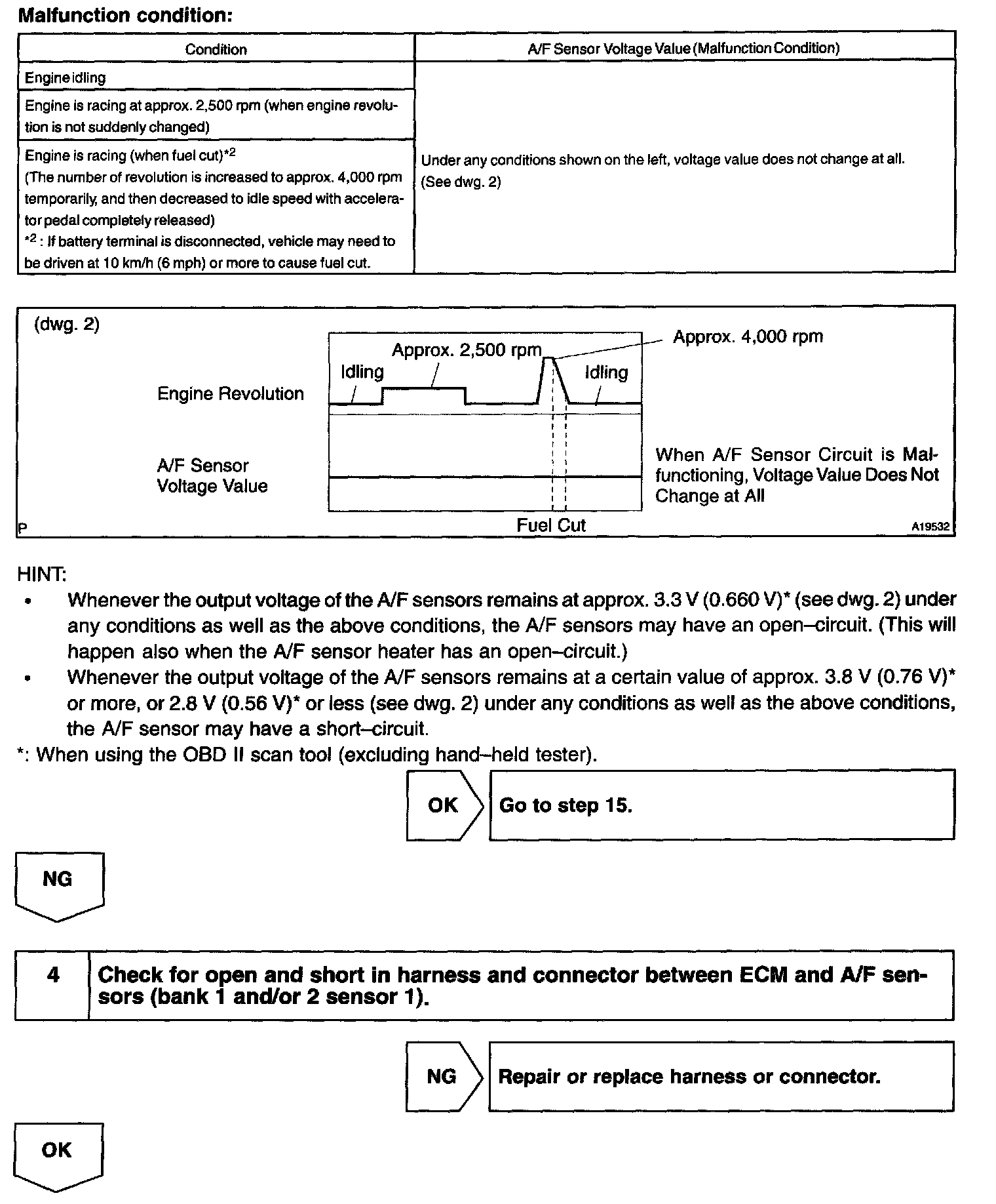 - The ECM controls the voltage of AFR+/AFL+ and AFR-/AFL- terminals of the ECM to the fixed voltage. Therefore, it is impossible to confirm the A/F sensor output voltage without the OBD II scan tool or hand-held tester.