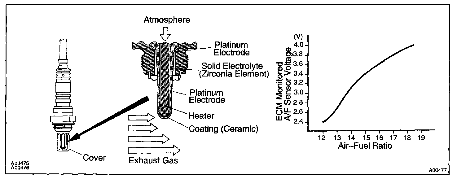 The A/F sensor is equipped with a heater which heats the zirconia element. The heater is controlled by the ECM. When the intake air volume is low (the temp. of the exhaust gas is low), current flows to the heater to heat the sensor for accurate oxygen concentration detection.