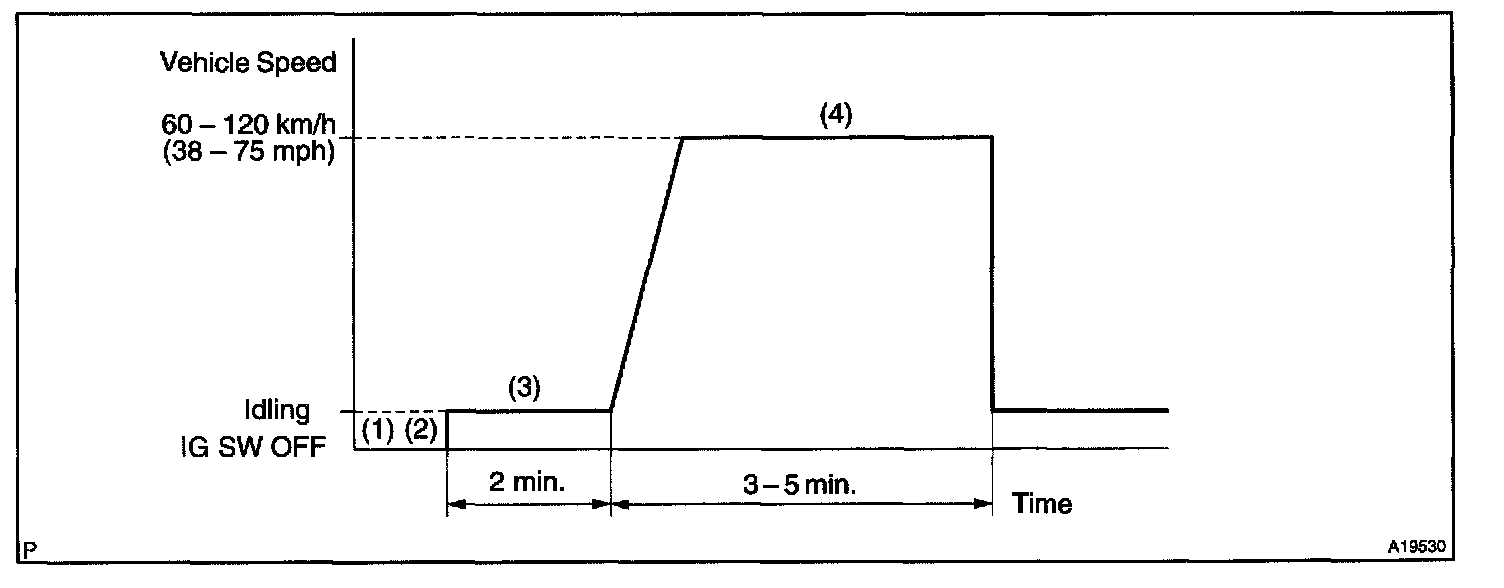 4. Drive the vehicle at 60-120 km/h (38-75 mph) and engine speed at 1,600-3,200 rpm for 3-5 minutes.
