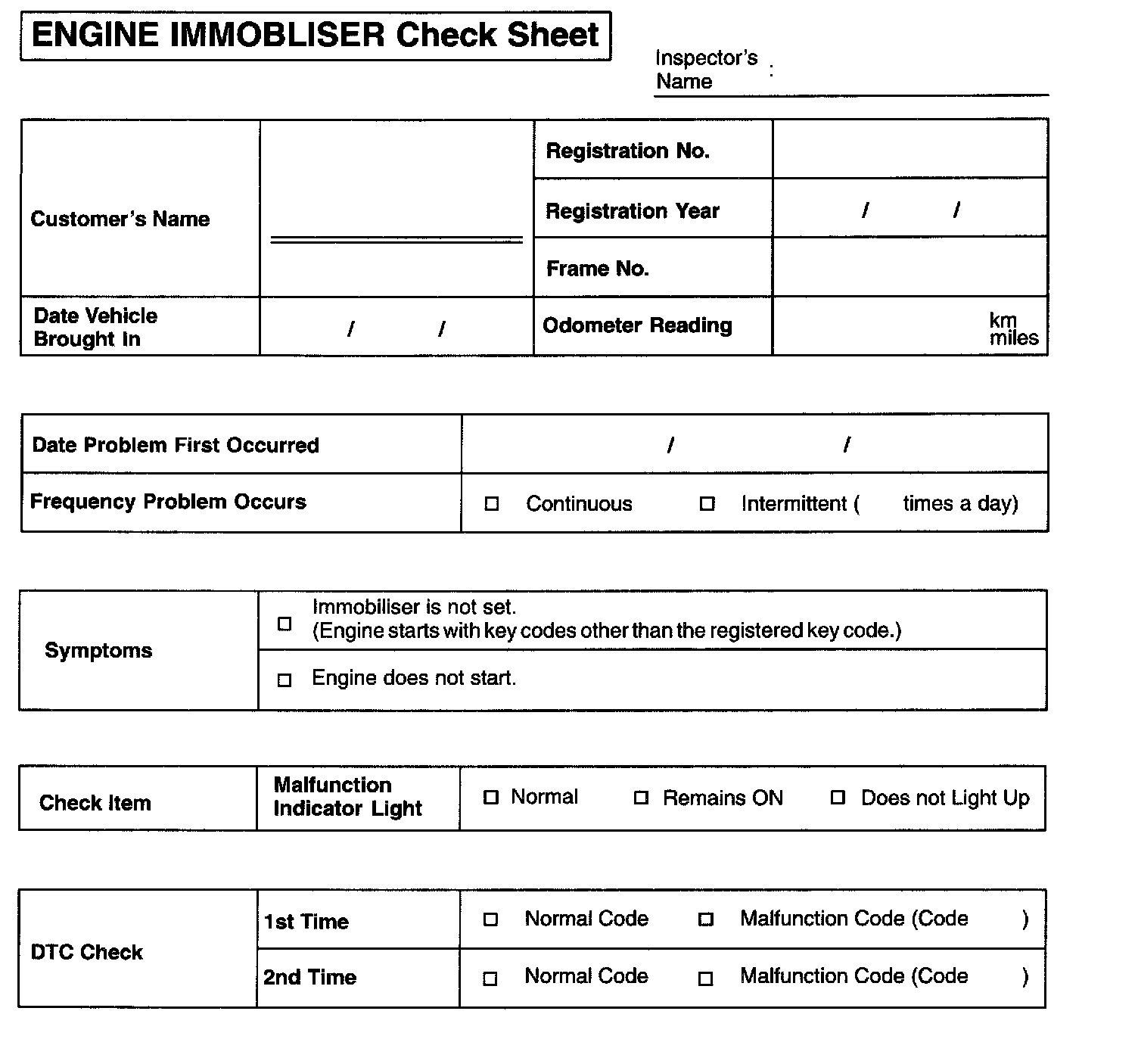 Engine Immobiliser Check Sheet: