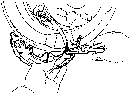 a. Using needle-nose pliers, connect the parking brake cable from the parking brake shoe lever.