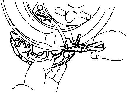 d. Using needle-nose pliers, disconnect the parking brake cable from the parking brake shoe lever.
