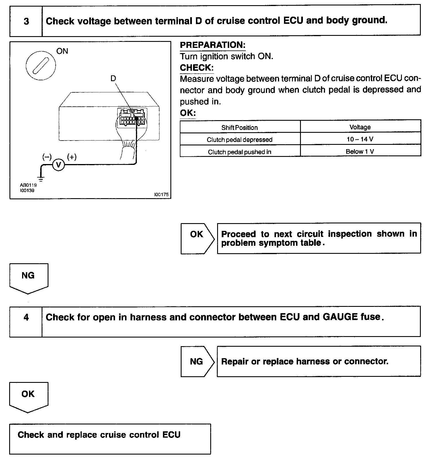 CIRCUIT DESCRIPTIONWhen the clutch pedal is depressed, the clutch switch sends a signal to the cruise control ECU. When the signal is input to the cruise control ECU during cruise control driving, the cruise control ECU cancels cruise control.