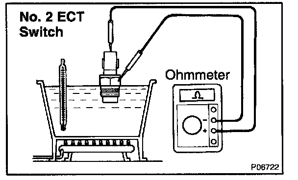 a. Using an ohmmeter, check that there is no continuity between the terminals when the coolant temperature is above 98 °C (208 °F).