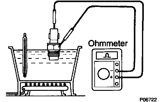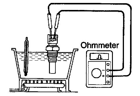 1) Using an ohmmeter, check that there is no continuity between the terminals when the coolant temperature is above 98°C (208°F).