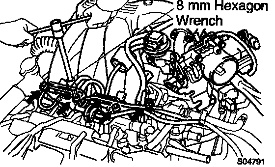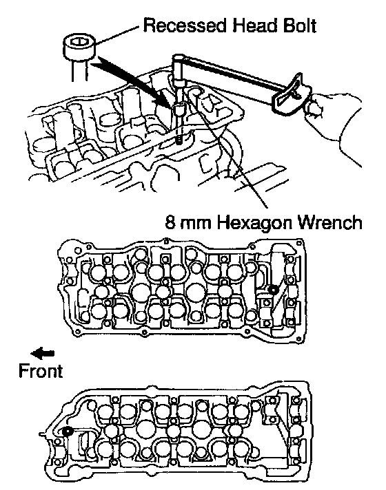 b. Using an 8 mm hexagon wrench, install the cylinder head bolt on each cylinder head, then repeat for the other side, as shown.