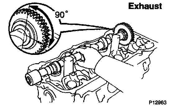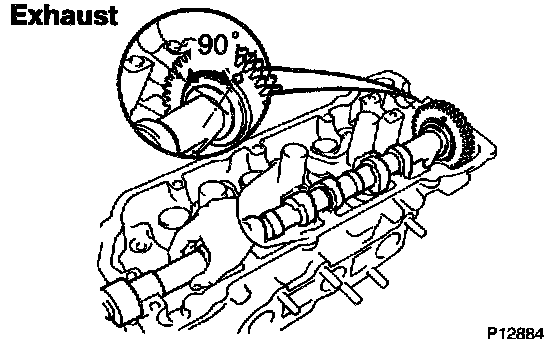 2) Place the exhaust camshaft at 90° angle of timing mark (2 dot marks) on the cylinder head.