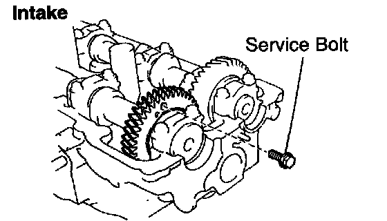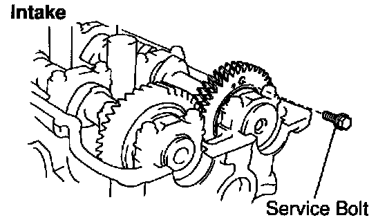 e. Using SST, align the holes of the camshaft main gear and sub-gear by turning camshaft sub-gear counterclockwise, and temporarily install a service bolt.