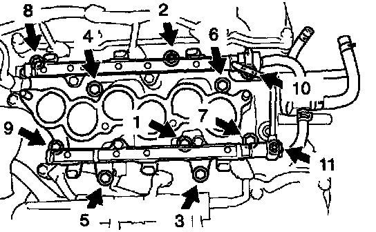 a. Install the intake manifold, delivery pipe and injectors assembly with the 9 bolts, 2 plate washers and 2 nuts. Uniformly tighten the bolts and nuts, in several passes, in the sequence shown.