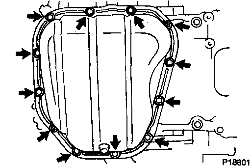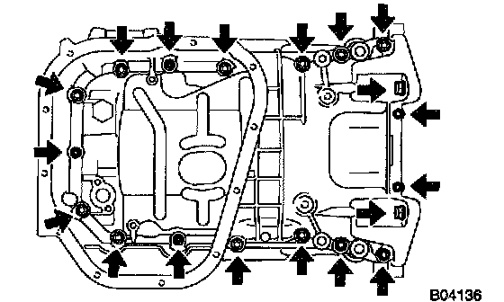 d. M/T: Install the oil pan with the 19 bolts. Uniformly tighten the bolts in several passes.