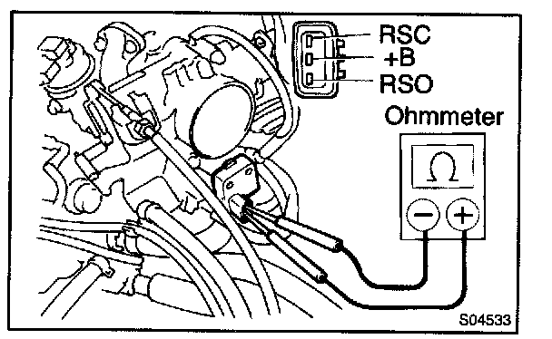 b. Using an ohmmeter, measure the resistance between terminal +B and other terminals (RSC, RSO).