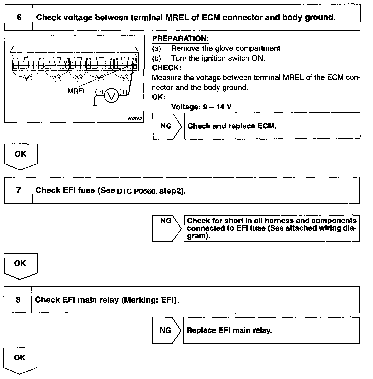 This signal causes current to flow to the coil, closing the contacts of the EFI main relay and supplying power to terminals +B of the ECM.