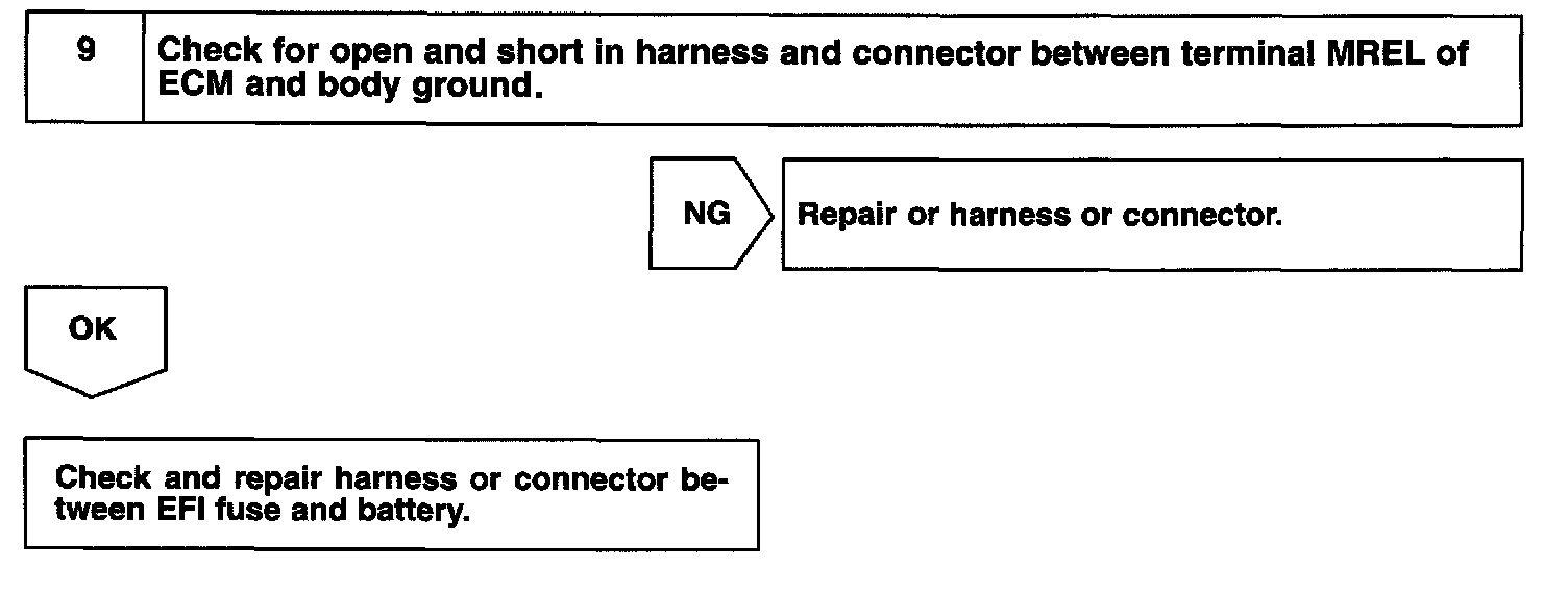 CIRCUIT INSPECTIONWhen the ignition switch is turned ON, battery positive voltage is applied to terminal IGSW of the ECM and the EFI main relay (Marking: EFI) control circuit in the ECM sends a signal to terminal MREL of the ECM switching on the EFI main relay.