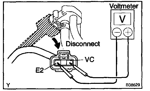 c. Using a voltmeter, measure the voltage between connector terminals VC and E2 of the wiring harness side.