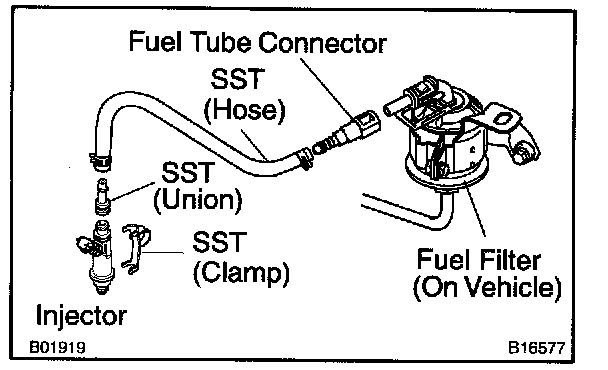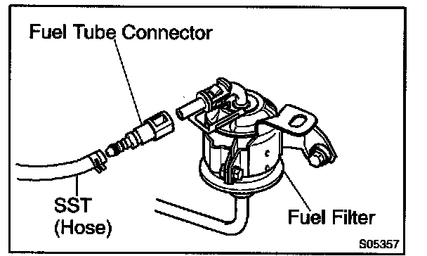 b. Connect SST (hose ) and fuel tube connector to the fuel filter outlet.