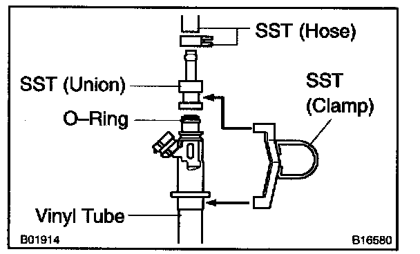 d. Connect SST (union and hose) to the injector, and hold the injector and union with SST (clamp).