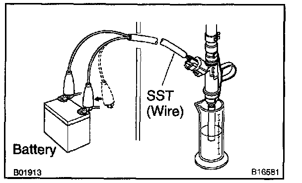 k. Connect SST (wire) to the injector and battery for 15 seconds, and measure the injection volume with a graduated cylinder. Test each injector 2 or 3 times.