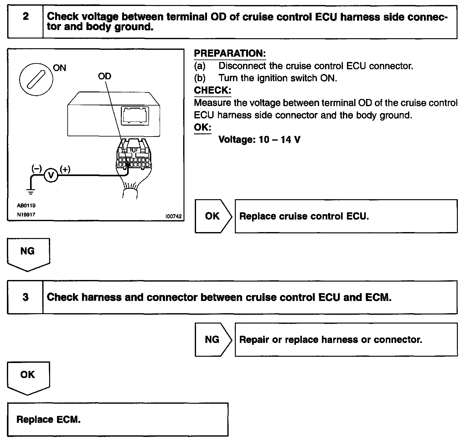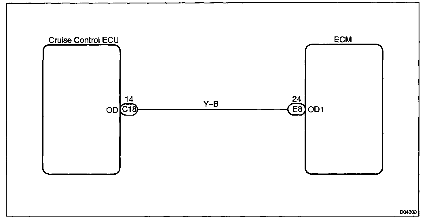 The cruise control ECU sends O/D cut signals to the ECM as necessary and the ECM cancels the shift to the overdrive until these signals are discontinued.