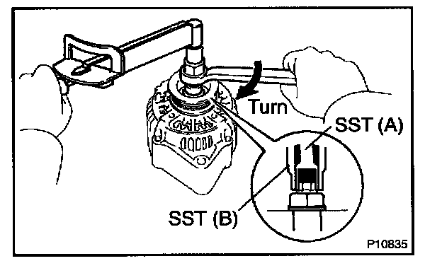 b. Hold SST (A) with a torque wrench, and tighten SST (B) clockwise to the specified torque.