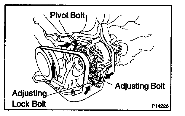 Loosen the pivot bolt, adjusting lock bolt, and adjusting bolt, and remove the drive belt.