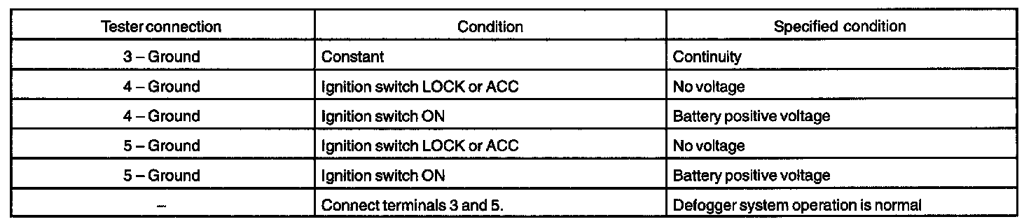 Disconnect the connector from the switch and inspect the connector on the wire harness side, as shown in the table.