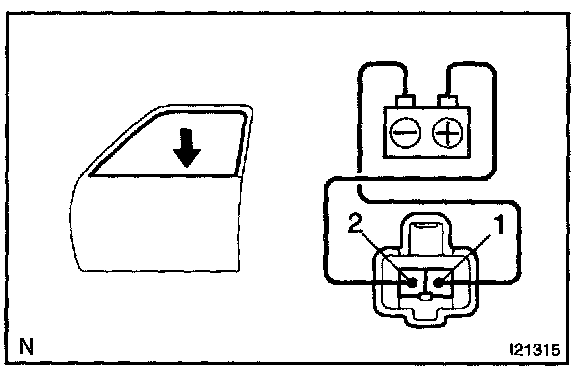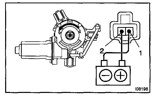 a. Connect the positive (+) lead from the battery to terminal 2 and the negative (-) lead to terminal 1, and check that the motor turns window up direction.