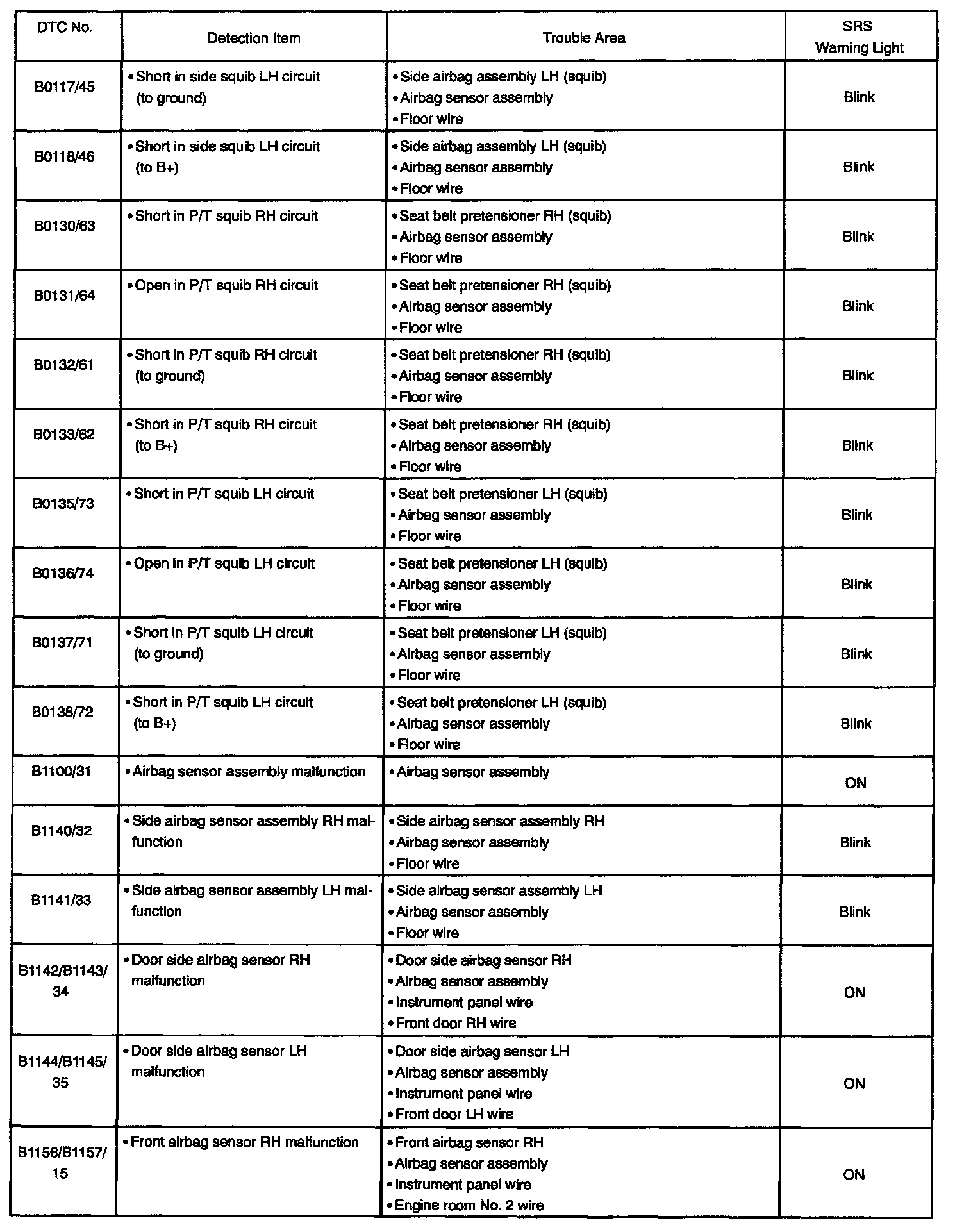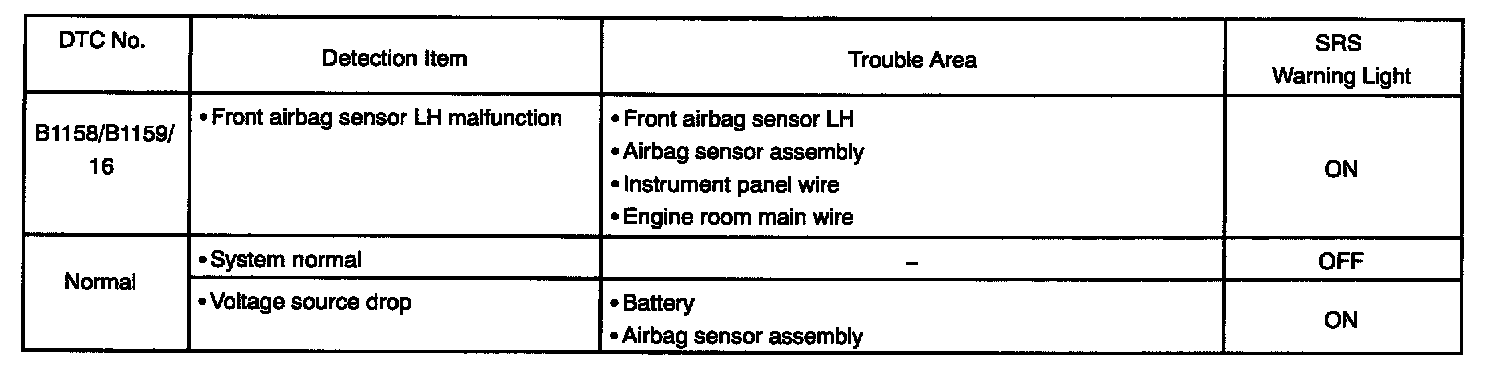 - In the case of any malfunction concerning any open circuit, ground short, or B+ short due to any squib, another malfunction code may not be detected. In this case, correct the malfunction currently indicated and then perform malfunction diagnosis again. Another malfunction code may then be detected.