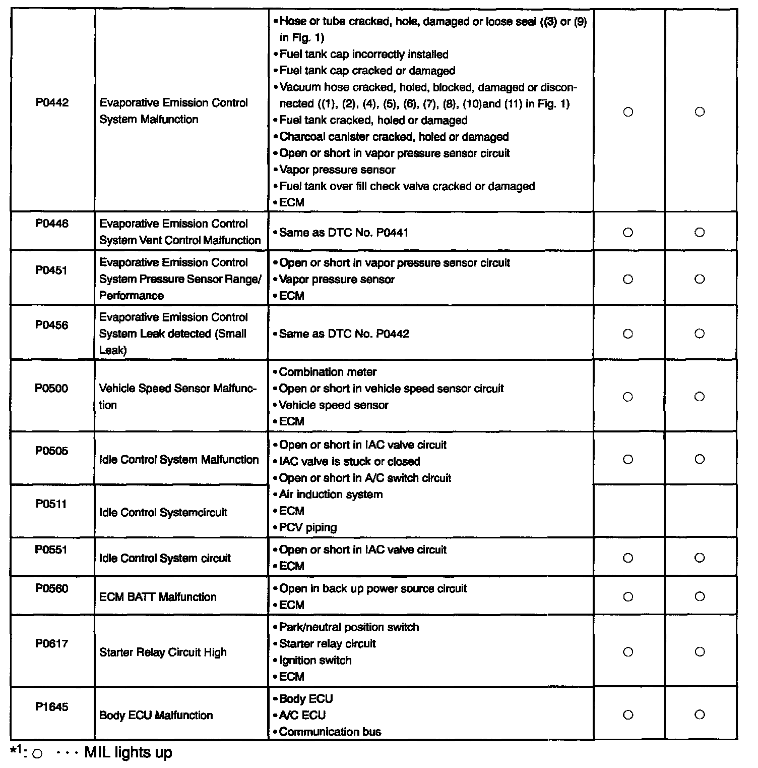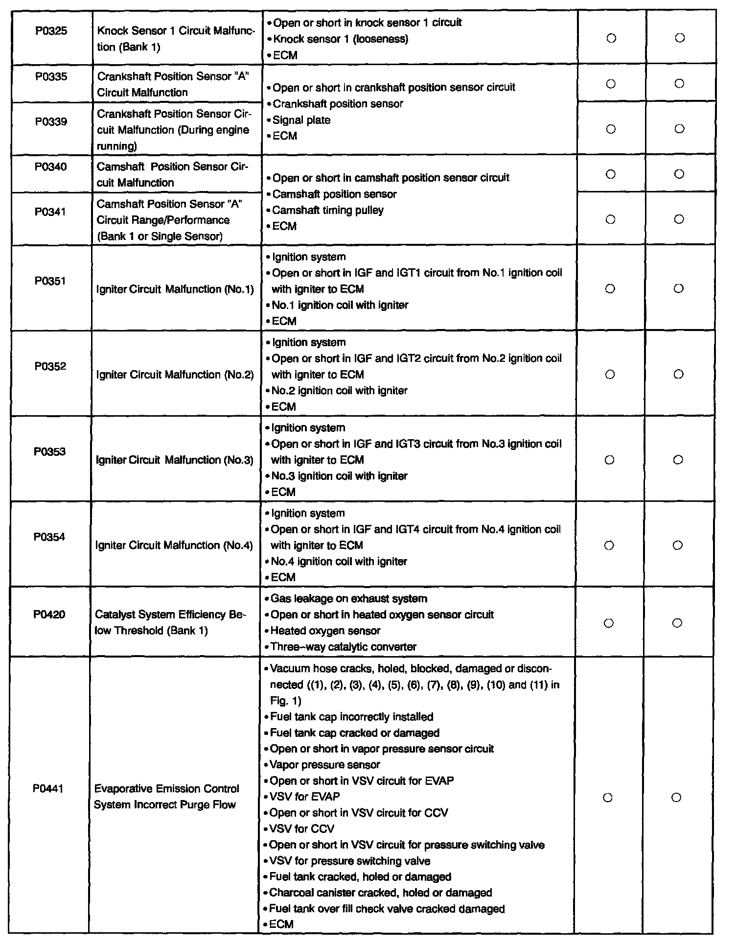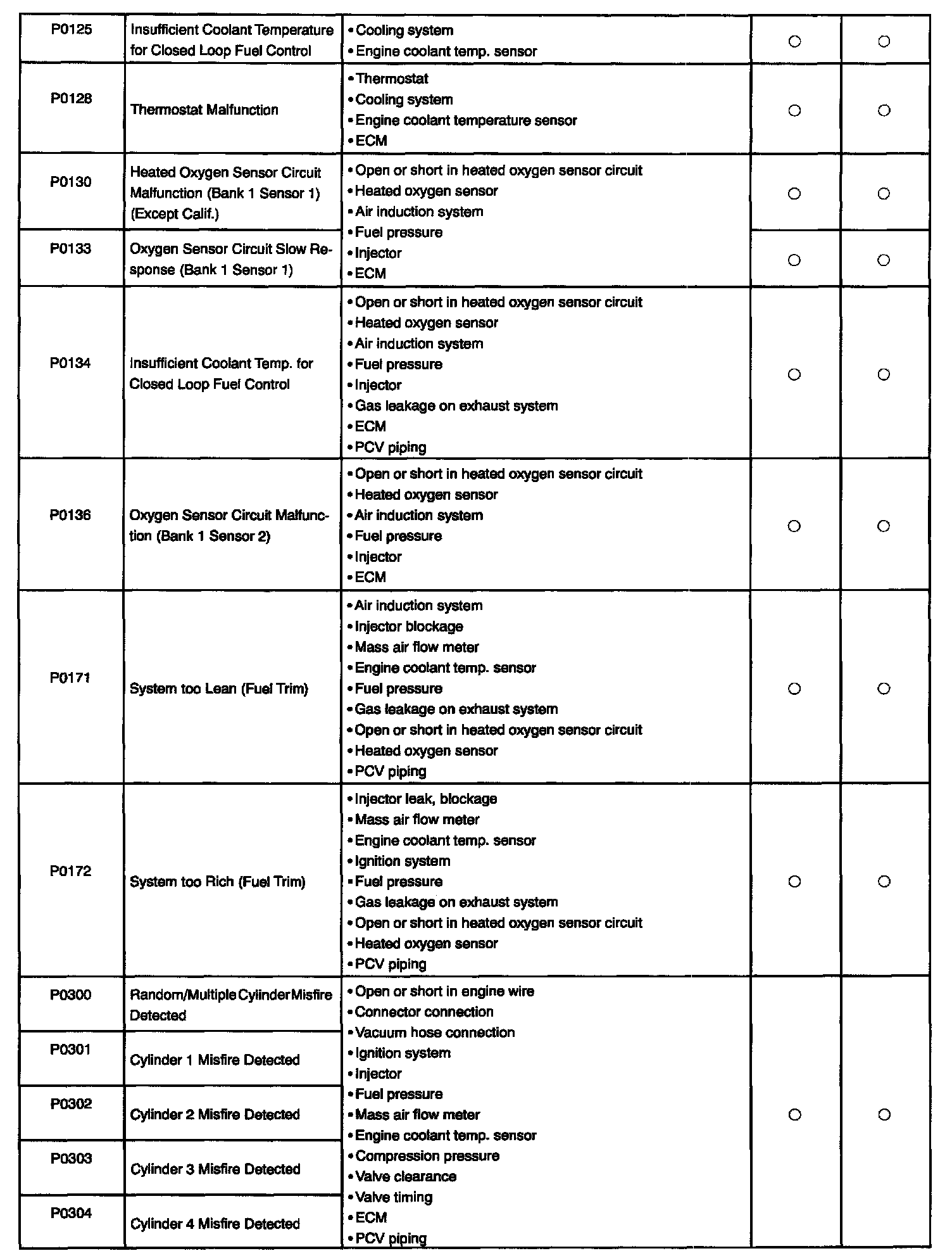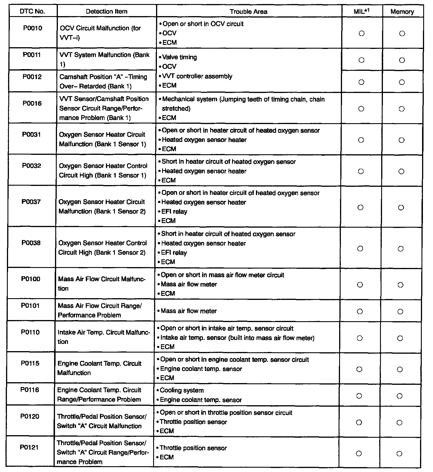 If a malfunction code is displayed during the DTC check in check mode, check the circuit for that code listed in the table. For details of each code, refer to the respective "DTC No." under "Trouble Code Diagnostic Charts".